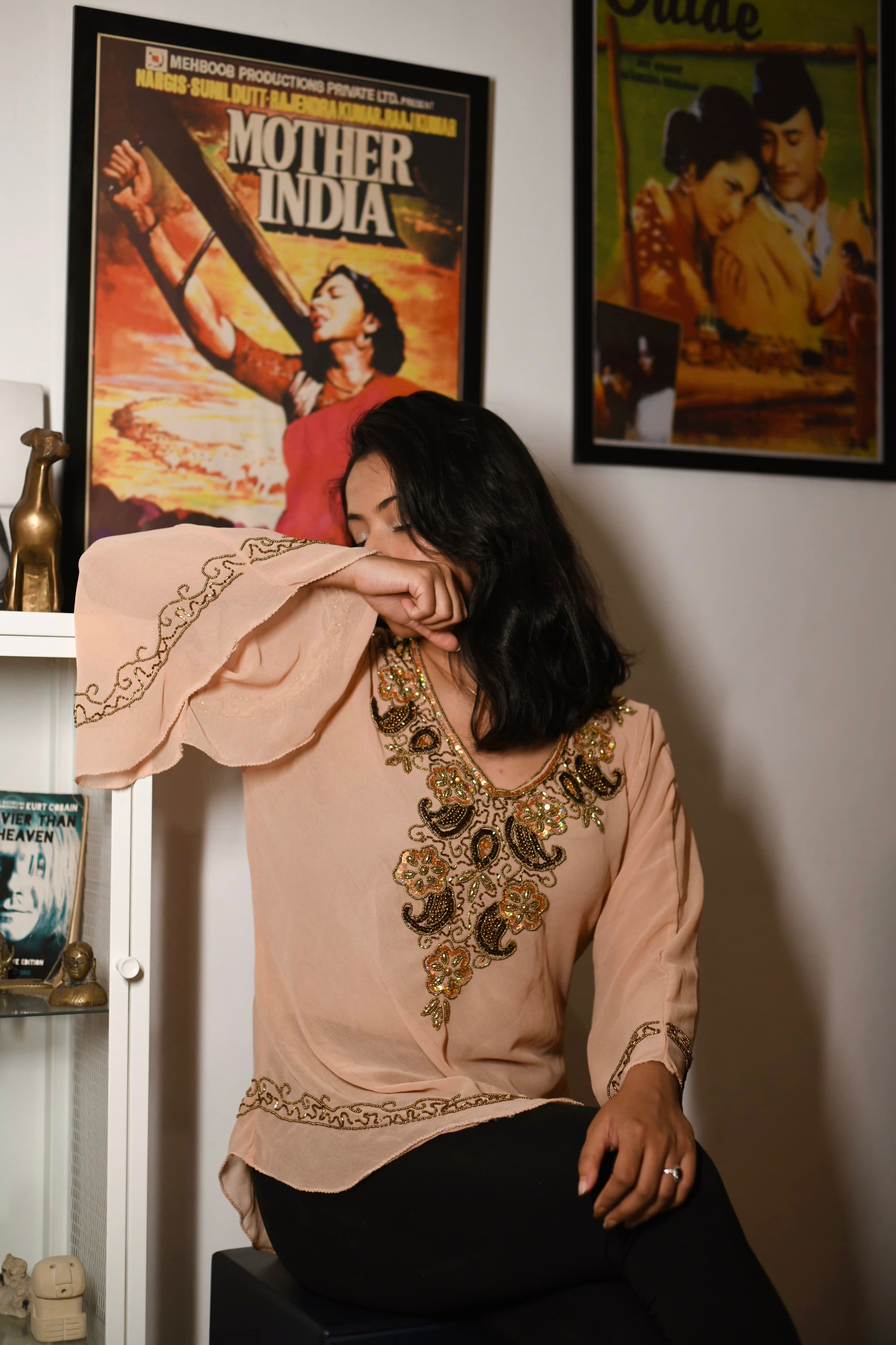Understated yet striking — this Rosy Nude sheer top with intricate hand embroidery is all about quiet luxury. The flowing bell sleeves and golden accents give it a vintage glam aura, while the neutral base makes it endlessly versatile.