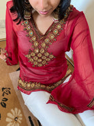 Adorned with intricate golden embroidery and mirror-sequin work along the neckline and hem, this piece is designed to command attention. The sheer georgette sleeves with flared cuffs add drama, while the rich red hue channels the unforgettable magnetism of Parveen Babi’s screen presence.