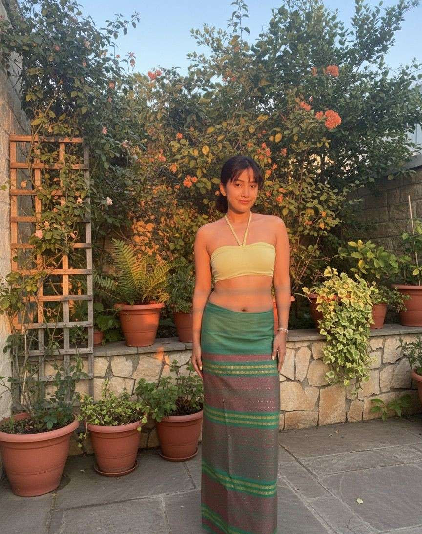 This wrap skirt features soft green tones with pink and gold woven-style patterns — a nod to the region’s traditional textiles, reimagined in a lightweight, easy-to-wear fabric.