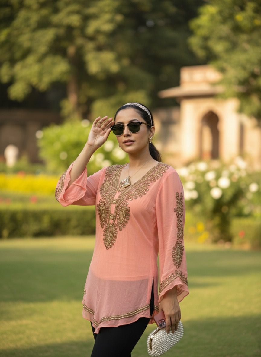 Soft, feminine, and irresistibly retro — this blush peach sheer top is hand-embroidered with intricate detailing that feels equal parts elegant and playful. The flowy silhouette and bell sleeves bring back the charm of old-school glam, while the delicate blush shade makes it perfect for both daytime chic and evening celebrations.