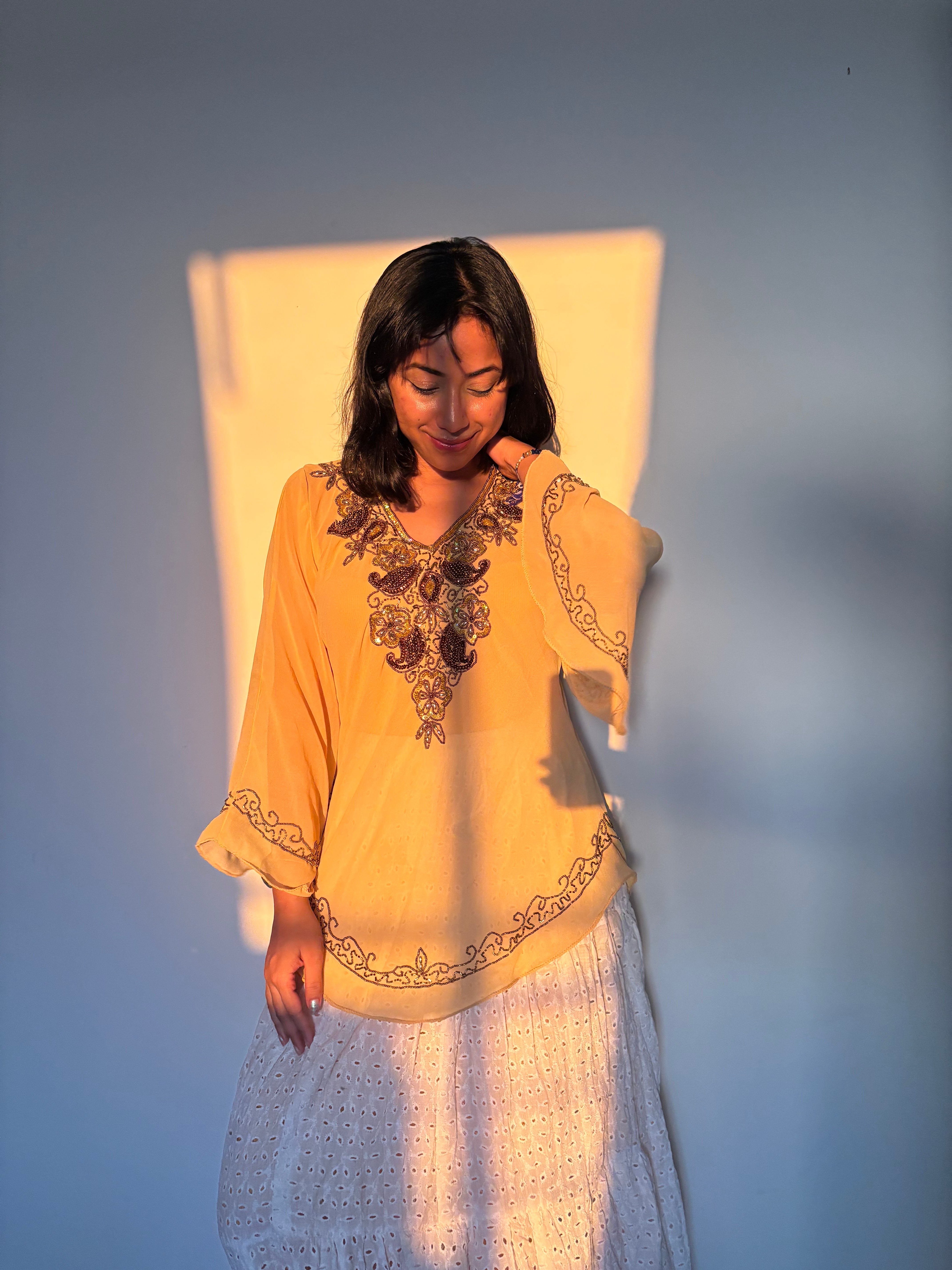 Style tip: Pair with white skirts or statement earrings for a dreamy golden-hour glow