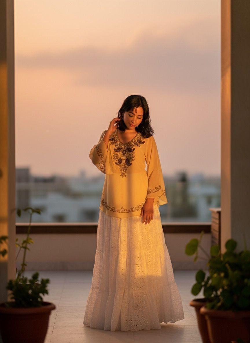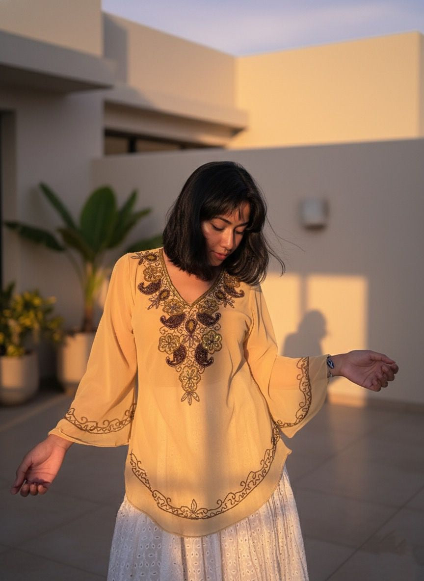 Soft as sunshine and timeless as a melody โ the Zeenat Aman Short Top in butter yellow is hand-embroidered with antique gold beadwork on airy chiffon, layered over a smooth satin lining. With flowy sleeves and a relaxed fit, itโs that effortless festive piece youโll reach for again and again.